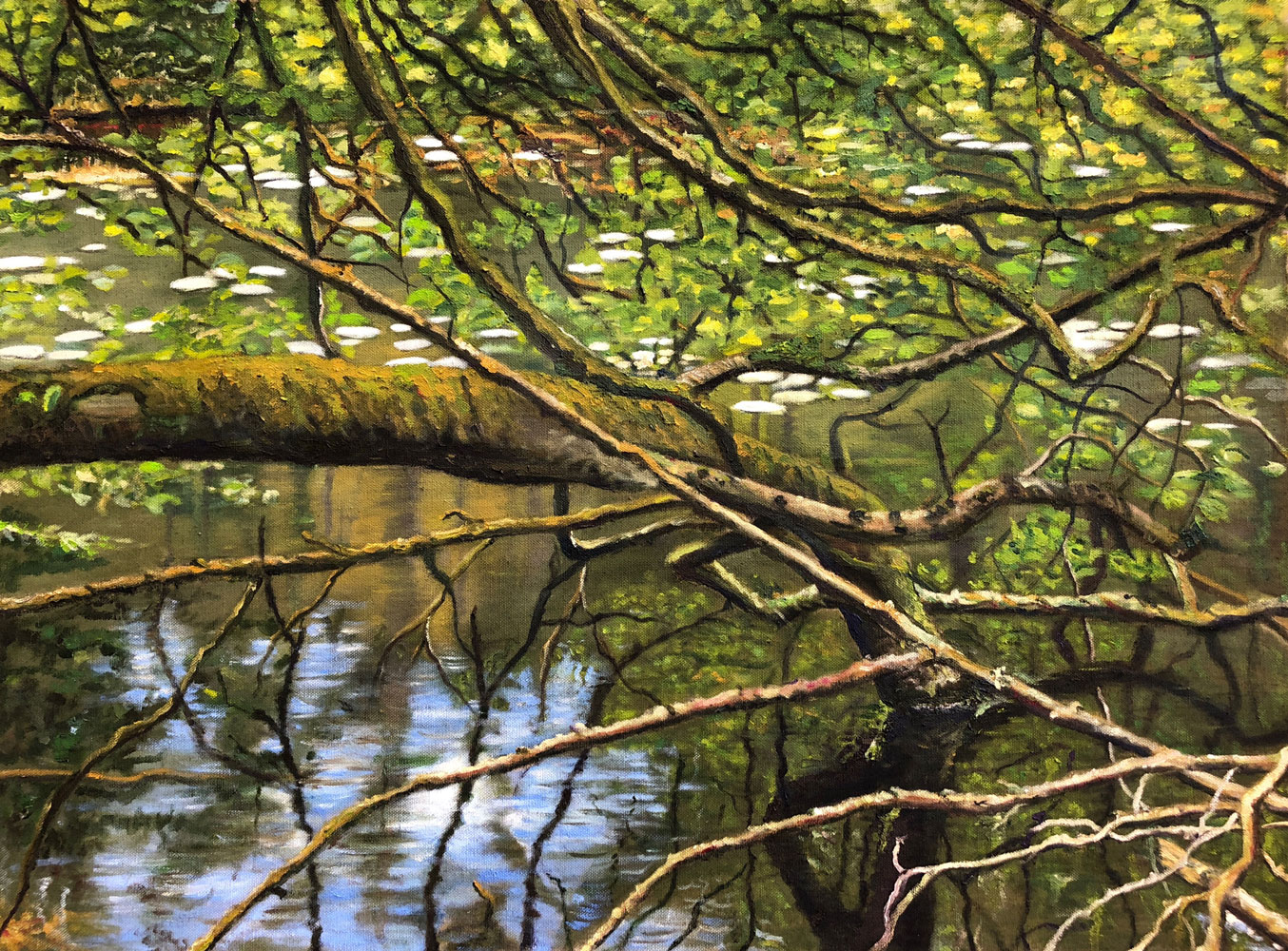 ENCI Groeve – Mossige mergelpoel / ENCI Quarry – Mossy marl pool (2020)Olieverf op ongeprepareerd linnen84 x 58 cm.