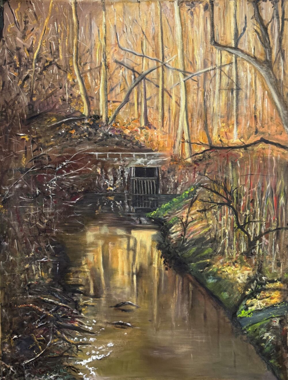 De Jeker vanaf de Roej Brögk / The river Jeker, seen from the ‘Roej Brögk’ (2022)Olieverf op ongeprepareerd linnen 85 x 85 cm